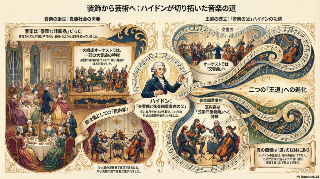 かつて音楽は、社交の場を彩る装飾的な「点」でした。しかしハイドンのような作曲家たちの挑戦によって、それは一つの連続した物語、つまり「線」へと進化していきました。